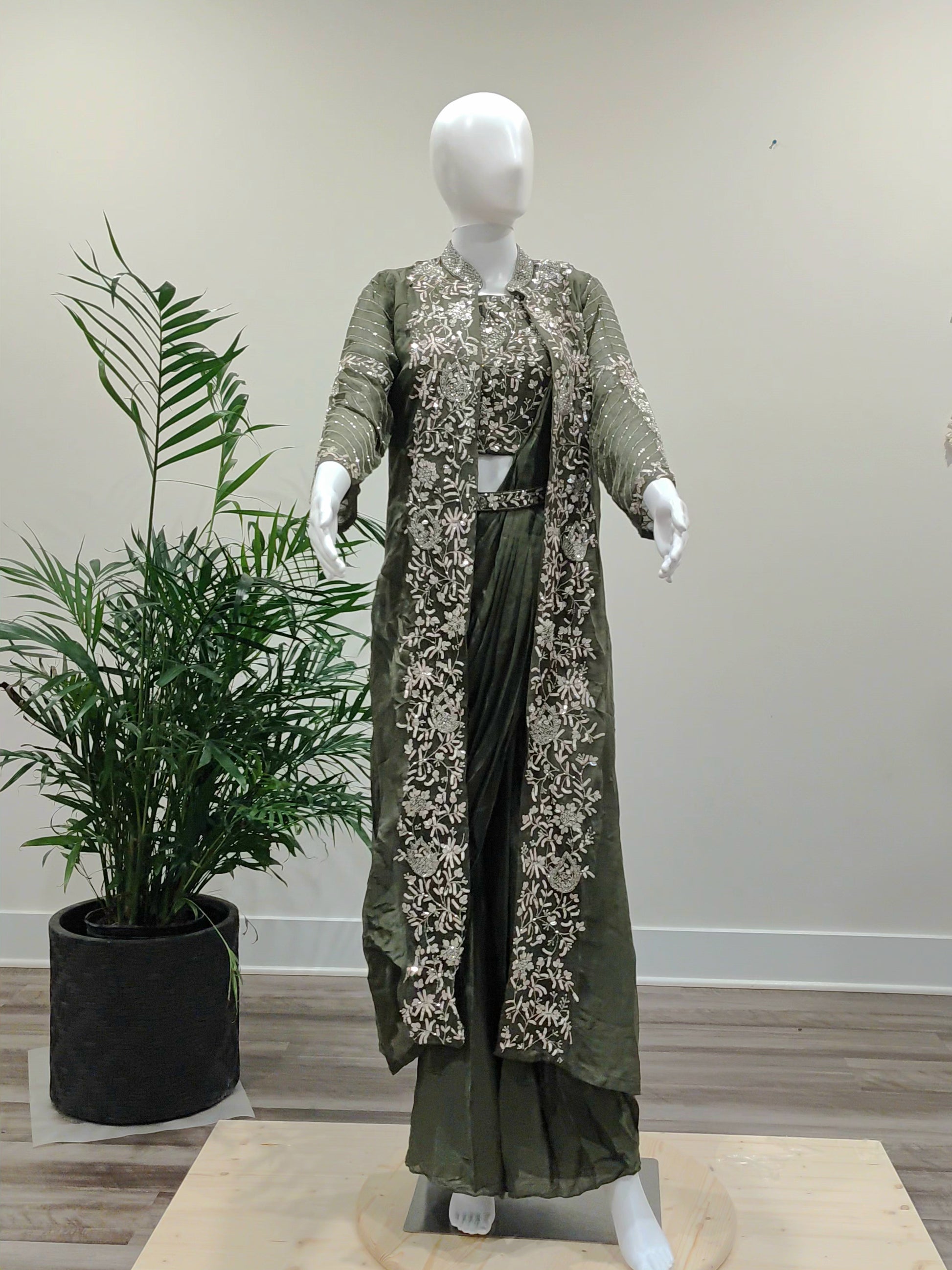 Turn heads with this ready-to-wear mehndi green saree, blending tradition with modern layering. The georgette base drapes effortlessly, while the long organza shrug is finished with all-over zarkan embellishments for a sparkling festive vibe. The size 44 georgette blouse, detailed with zarkan embroidery, completes the look, making it a perfect pick for weddings, festive gatherings, and evening occasions.