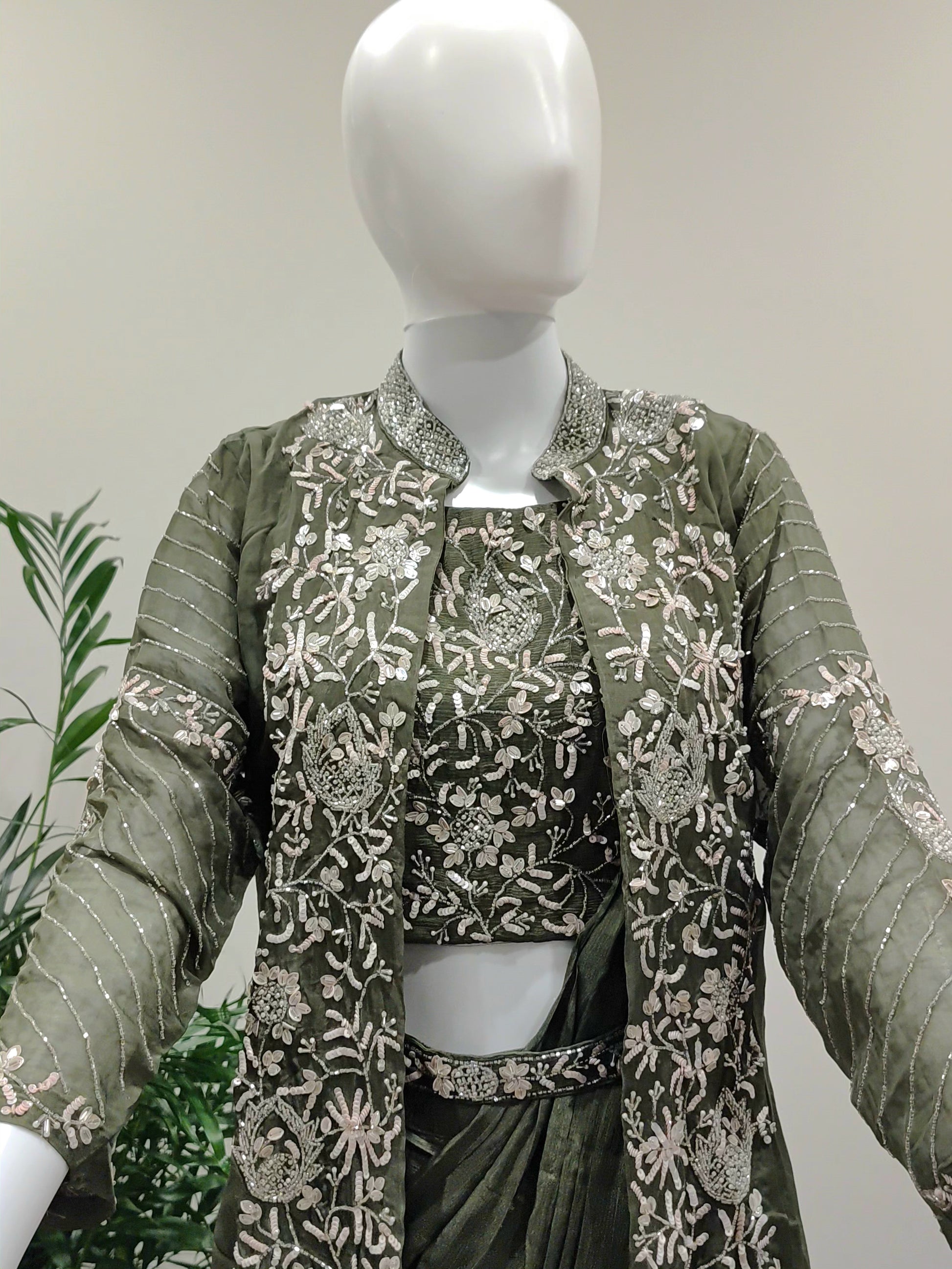 Mehndi Green Georgette Ready-to-Wear Saree | Organza Shrug & Zarkan Work